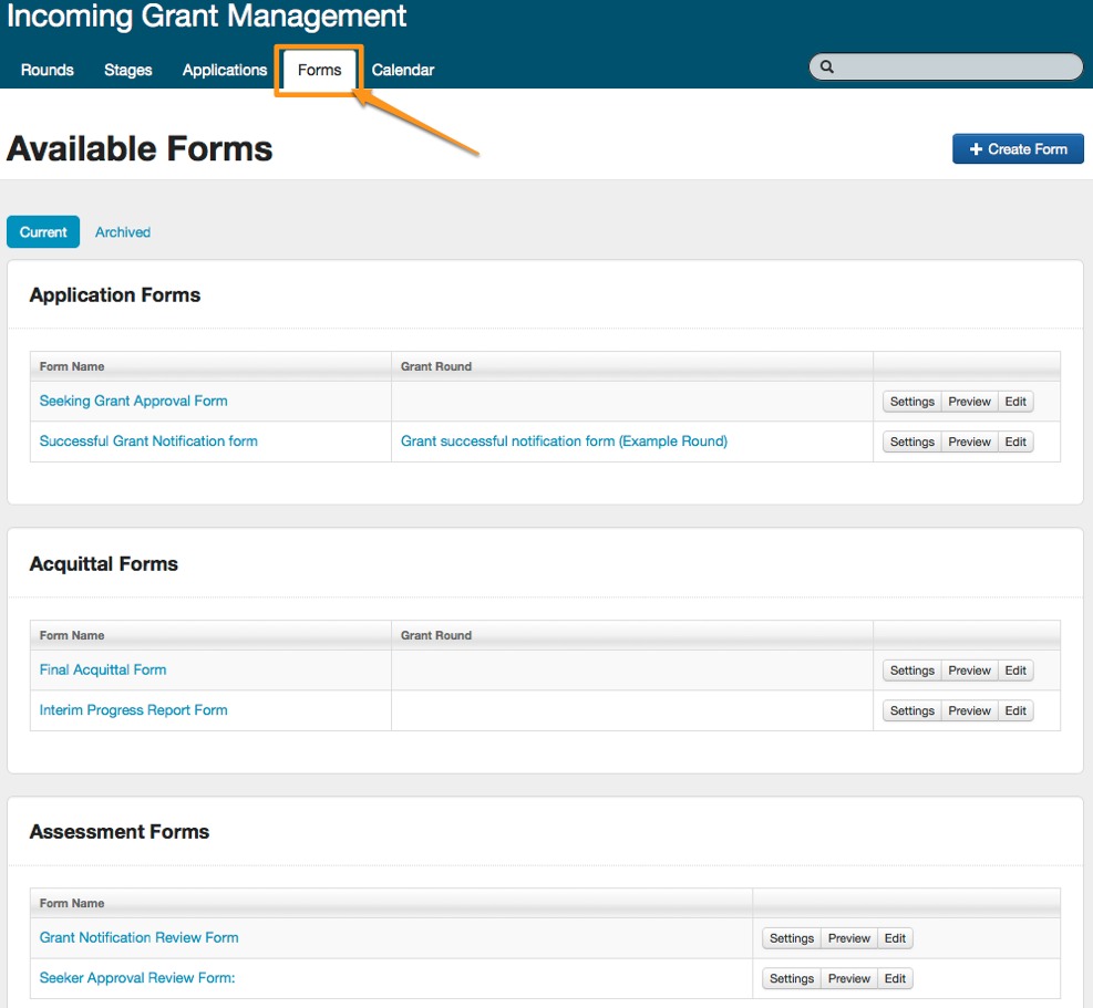 - Click on the 'Forms' tab: The forms screen will give you a listing of existing online form templates that the SmartyGrants team have already created for you. From here, you also have the ability to edit these forms, the settings for each form or create new forms.