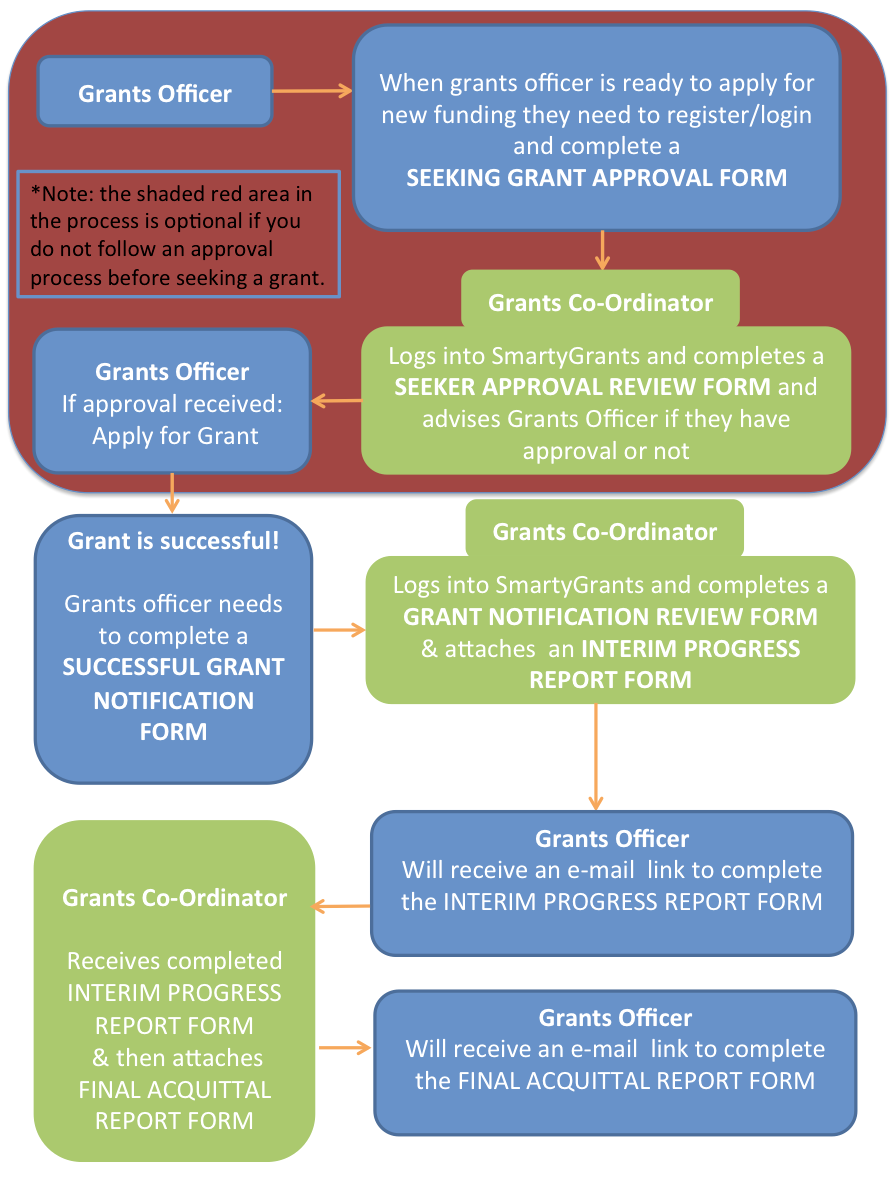 SEEKING GRANT APPROVAL FORM (Application): This is the form your grants officers need to complete before they actually apply for the grant. This is an approval form that you will review and either sign off for approval or reject.